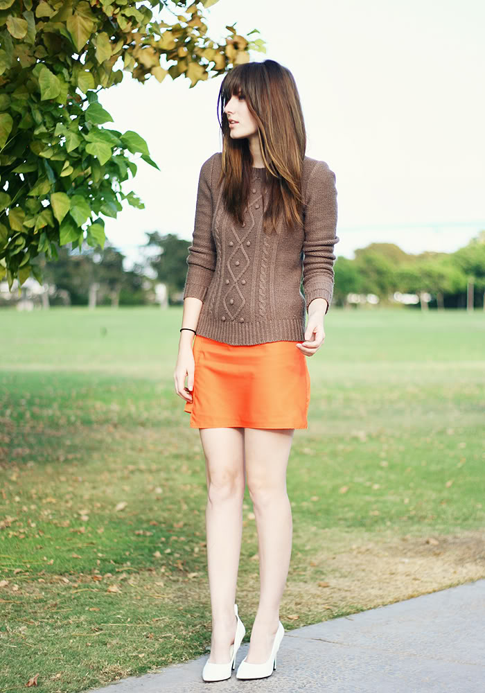 I'm very particular about wearing orange, I suppose it's the reason for me not owning much of it. My closet is home to a lot of black pieces, which when pairing with orange, you can look Halloween-ish very fast. White and brown were easy to add to get a feel for a more autumn color pallet. If you like the skirt, make sure you check out the diy tutorial below!